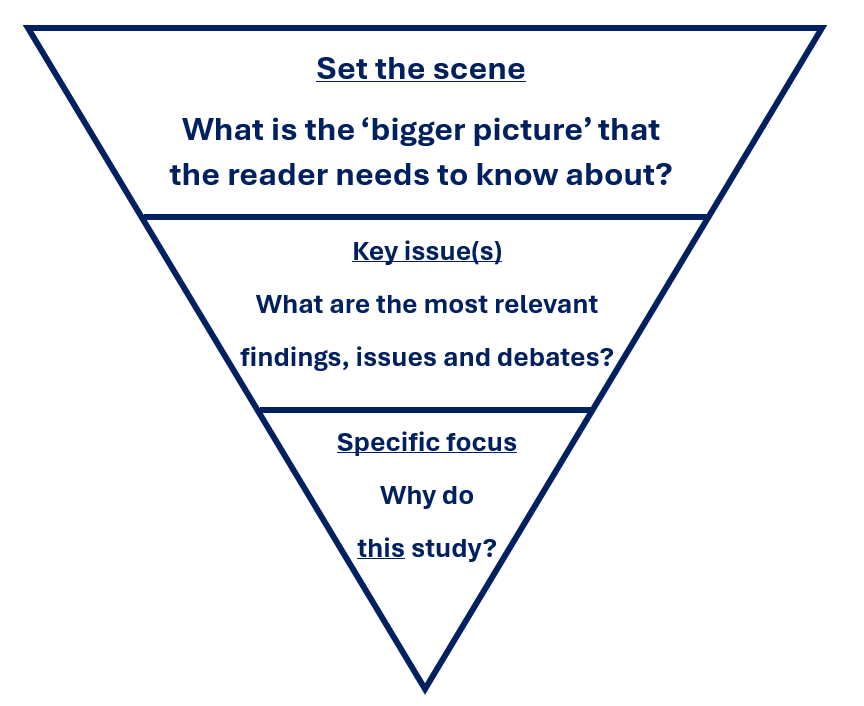 Follow the APA-style funnel structure: begin with a broad overview of the topic, then narrow the focus until you reach your specific rationale and research question(s).